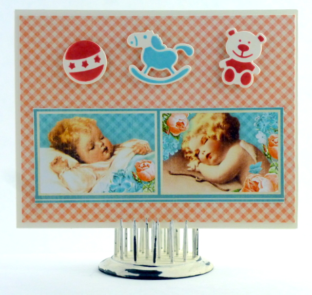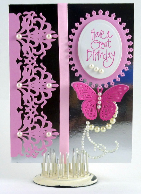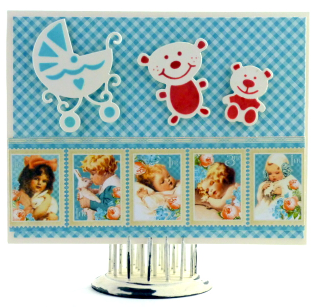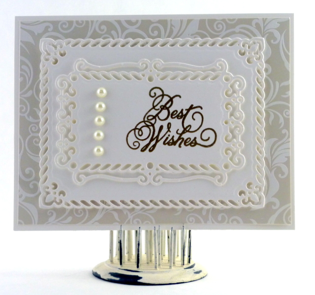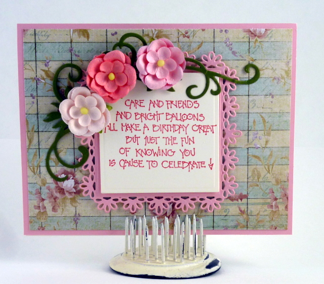 This is a 5″ by 6 1/2″ card. The dies used were “Classic Square Small”, “Triple Floral”, and “Floral Flourishes” – all Spellbinders. The pattern paper was from “The Primrose Stack” by DCWV. The flowers were by Prima, and the ink was by Close to my Heart.