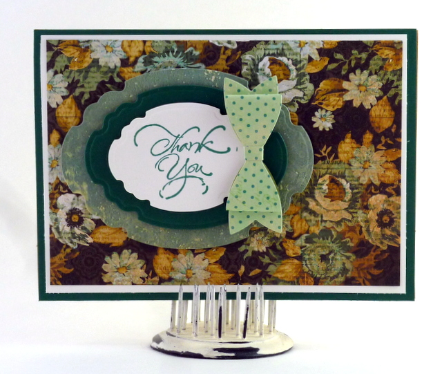 This is a 5″ by 7″ card. The pattern paper is from Kaisercraft 75 Cents Collection – page – “Penny” and Bo Bunny Collection Ambrosia Lily. The cardstock and ink is “Christmas Pine” from Gina K Designs. The Stamp is from Hampton Art. The dies are Spellbinders S4-601 Labels 33 and Spellbinders S3-283 Bow Ties.