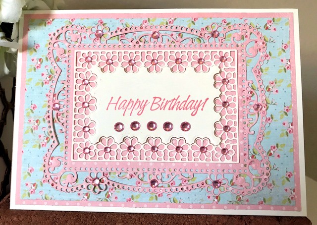 This is a 5″ by 7″ card. The pattern paper is from Graphic 45 Seasons Collection – 12 by 12 Pattern and Solids Paper Pad. The ink is “Tomato Soup” and the cardstock “Ivory” by Gina K Designs. The stamp is Spellbinders SBS-096 Special Birthday Sentiments. The die is Spellbinders S5-329 Hannah Elise Layering Frame Small.