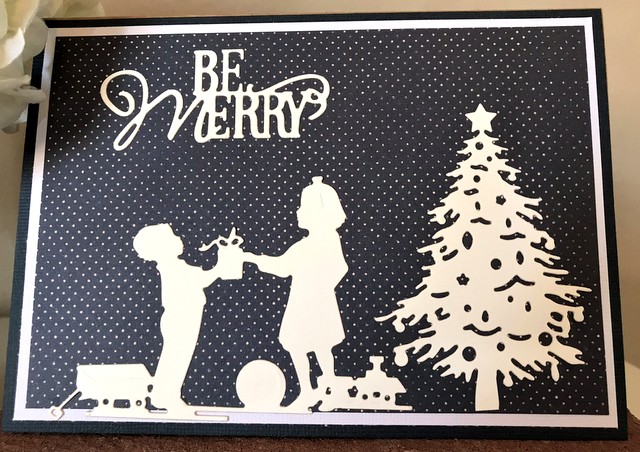 This is a 5″ by 7″ card. The pattern paper is from Paper Studio “Joyeux Noel”. The dies are Spellbinders S4-882 Deck the Hall Holiday 2017, Spellbinders S4-829 For You Holiday 2017, and Spellbinders S3-269 Naughty or Nice Holiday 2017.