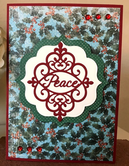 This is a 5″ by 7″ card. The pattern paper is from Paper Studio “Joyeux Noel” Collection. The dies are Spellbinders S4-576 Labels 50 and Spellbinders S2-120 Peace Sentiment. The bling is “Red Bubbles” by Queen & Co.