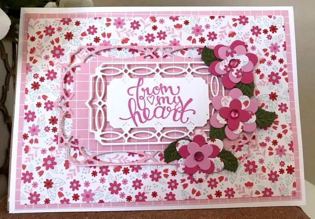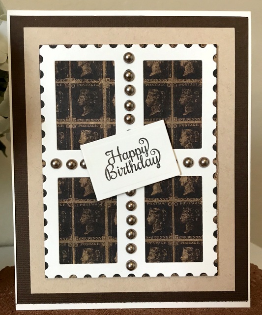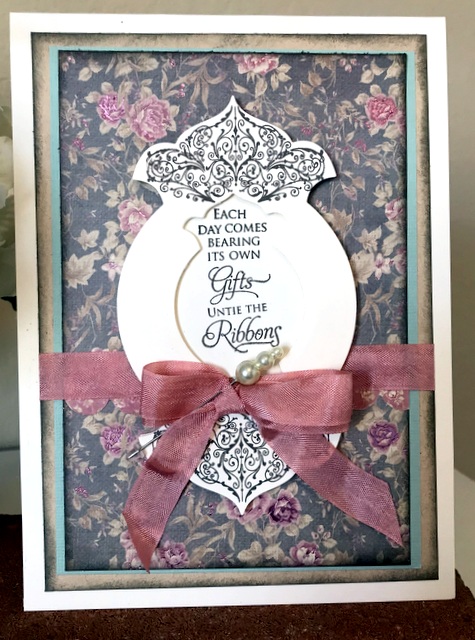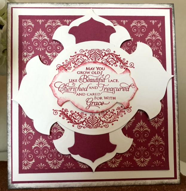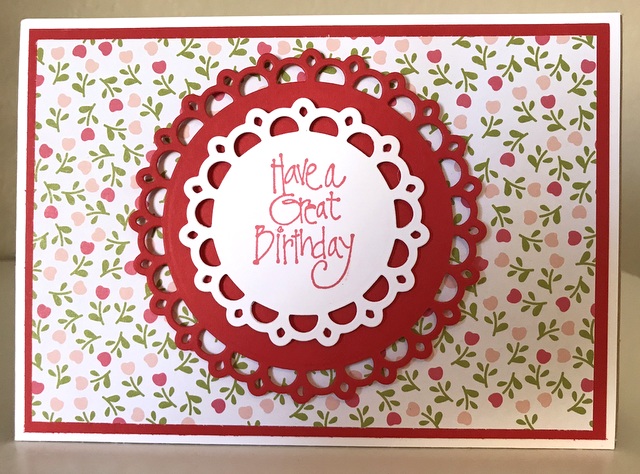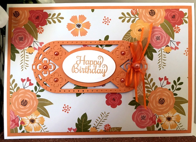 This is a 5″ by 7″ card. The pattern paper is from Jillibean Farmhouse Stew Collection – page “Gimme Some Sugar”. The cardstock and ink is “Sweet Mango” from Gina K Designs. The stamp is Spellbinders SBS-096 Special Birthday Sentiment. The die is Spellbinders S5-249 Renaissance Tags One.