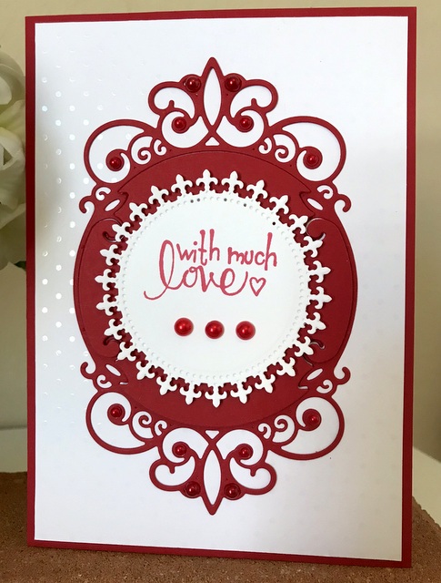 This is a 5″ by 7″ card. The pattern papers is from DCWV The Silver Lining Stack. The cardstock and the ink are “Cherry Red” by Gina K. Designs. The bling is “Berry Red” by Queen & Co. The stamp is Spellbinders SBS 138 Tiny Sentiments, Spellbinders S4-444 Royal Circle, and Spellbinders S5-342 Tiara Rondelle.
