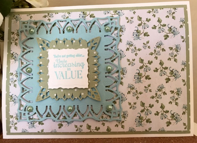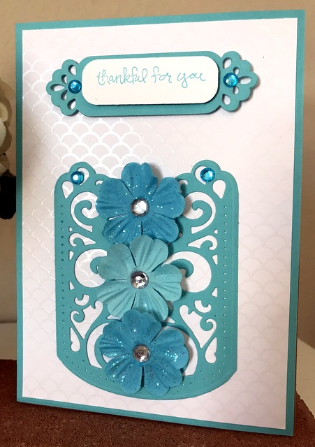 This is 5″ by 7″ card. The pattern paper is by DCWV The Silver Lining Stack. The cardstock and ink is “Turquoise Sea” by Gina K Designs. The bling is “Out to Sea” by Queen & Co. The dies are Spellbinders S5-128 Fancy Framed Tags Two and Spellbinders S5-343 Filigree Veil.