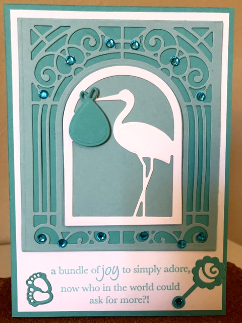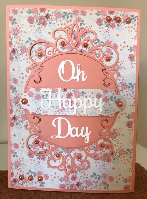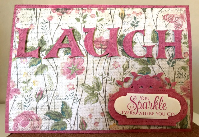 This is a 5″ by 7″ card. The pattern paper is Moments in Time Collection by Photo Play – page “Memories”. The ink is “Passionate Pink by Gina K Designs. The cardstock is “White” by Gina K Designs. The dies are Spellbinders S7-214 Alphabet and Spellbinders S4-543 Victorian Tags Two.