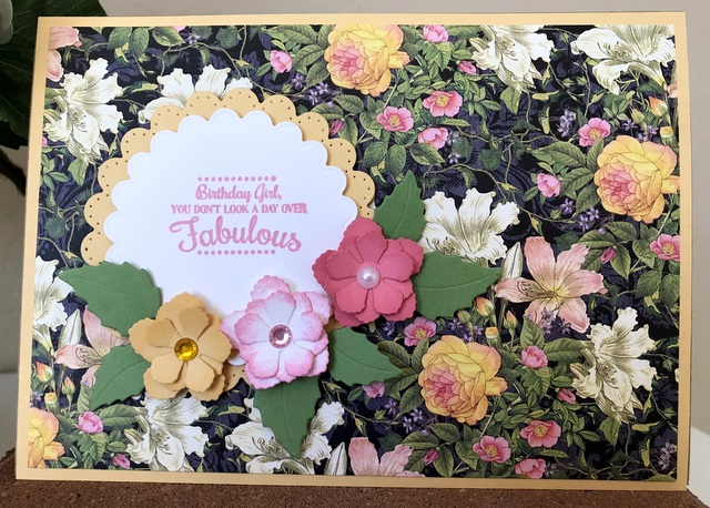 This is a 5″ by 7″ card. The pattern paper is Graphic 45 Floral Shoppe Collection – page “Indigo Lilies”. The cardstock is “Sweet Corn” and the ink is “Dusty Rose” by Gina K Designs. The dies are Spellbinders S4-911 Fancy Scalloped Edge Circles and Spellbinders S3-335 Rose Buds. The stamp is Spellbinders SBS-096 Special Birthday Sentiments.