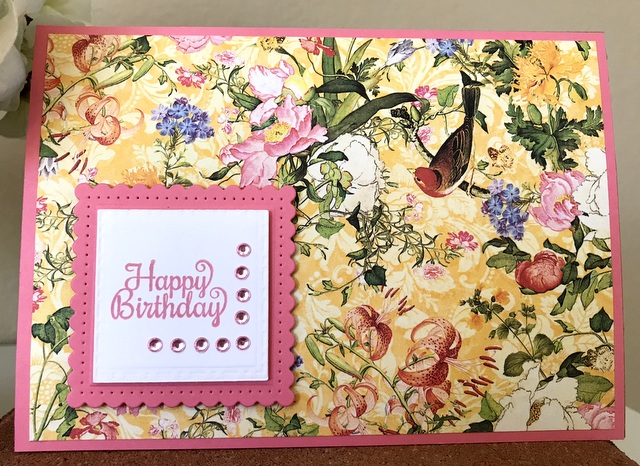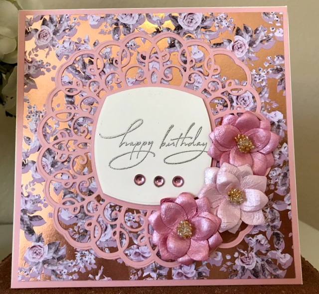 This is a 5″ by 7″ card. The pattern papers is from Graphic 45 Floral Shoppe Collection – page “Golden Serenity”. The cardstock and ink is “Dusty Rose” by Gina K. Designs. The bling is from Queen & Co. The die is Spellbinders S4-909 Fancy Edged Squares. The stamp is Spellbinders SBS-096 Special Birthday Sentiments.