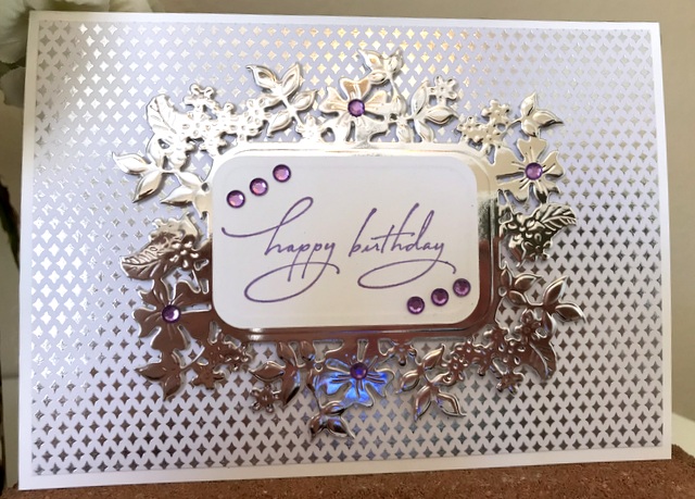 This is a 6″ by 6″ card. The pattern paper is from Prima Lavender Collection. The bling is “Bubbles Light Pink” by Queen & Co. The embossing powder is “Silver” by Ranger. The die is Spellbinders S5-369 Ringlet Round.