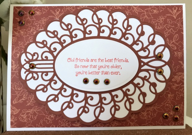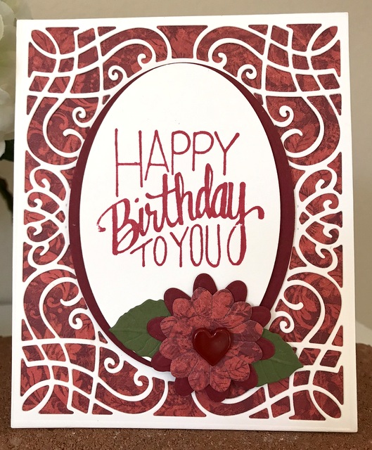 This is a 5″ by 7″ card. The pattern paper is Carta Bella Welcome Home Collection – page “Flower Market. The cardstock and ink is “Faded Brick” by Gina K Designs. The bling is “Black” iridescent bubbles by Queen & Co. The die is Spellbinders S5-365 Sweetheart Swirl.