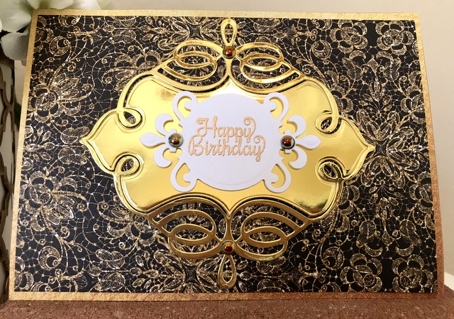 This is a 5″ by 7″ card. The pattern paper is from DCWV Solid Gold Premium Stack. The bling is “Black” iridescent bubbles by Queen & Co. The dies are Spellbinders S5-042 and Spellbinders S4-927 Trefoil Crest. The embossing powder was “Gold” from Ranger.