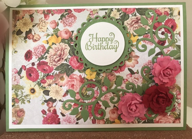 This is a 5″ by 7″ card. The pattern papers is from an Authentique Dame Collection – page “Dame Six”. The cardstock and ink is “Green Grass” by Gina K Designs. The dies are Spellbinders S4-910 Open Scallop Edge Circles and Spellbinders S2-296 Swirl Leaf Branch.
