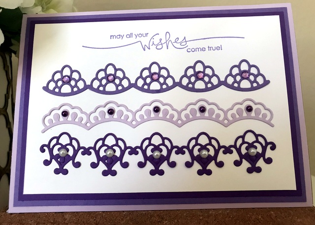 This is a 5″ by 7″ card. The cardstock is “White”, “Lovely Lavender”, “Wild Lilac”, and “Vibrant Violet” by Gina K Designs. The bling is from Queen & Co. The die is Spellbinders DOM-Feb18.
