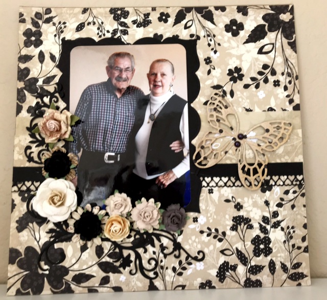 This is a scrapbook page of my step-father and mom. They had 41 wonderful years together. The dies are Spellbinders S5-051 Fanciful Flight and Spellbinders LF 347 Grand Labels 23.