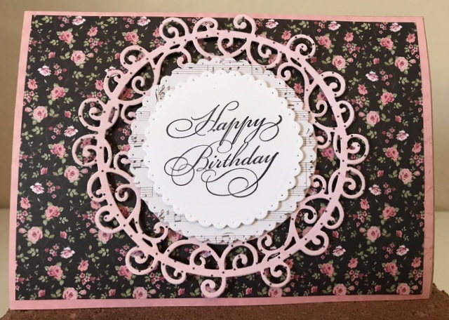 This is 5″ by 7″ card. The pattern paper is Photo Play Paper – Vintage Girl Collection – pages “Tiny Prints Black Floral”, “Tiny Prints Green Floral”, and “Tiny Prints Quad 1”. The dies are Spellbinders “Miss You Swirl” and Elizabeth Craft Design, Inc. “Dotted Scallop Circles”. The ink is Memento – “Tuxedo Black”.