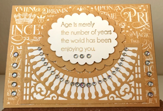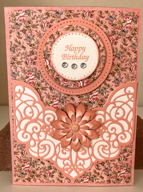This is a 5″ by 7″ card. The pattern paper is Graphic 45 Princess Collection – page “Princess”. The cardstock and ink is “Peach Bellini” from Gina K Designs. The die is Amazing Paper Grace Die of the Month – January by Spellbinders. The another die is from Elizabeth Craft Designs – “Dotted Scallop Circle. The bling is Bubbles “Clear” by Queen & Co.