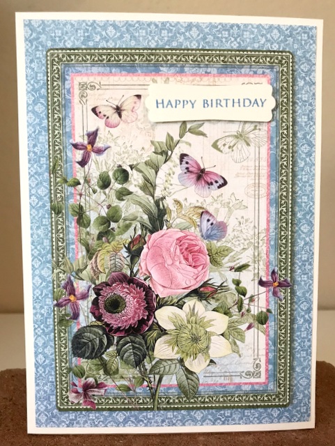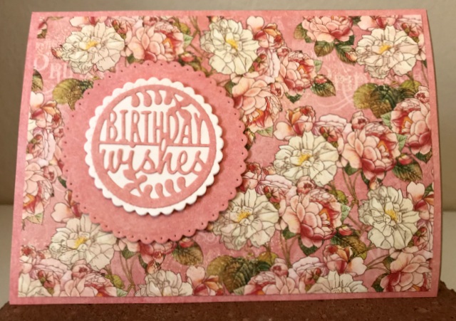 This is a 5″ by 7″ card. The pattern paper is Graphic 45 Princess Collection – page “Roses for Royalty”. The die is Spellbinders “Small Die of the Month – December 2018. The cardstock is “White” by Gina K Designs.