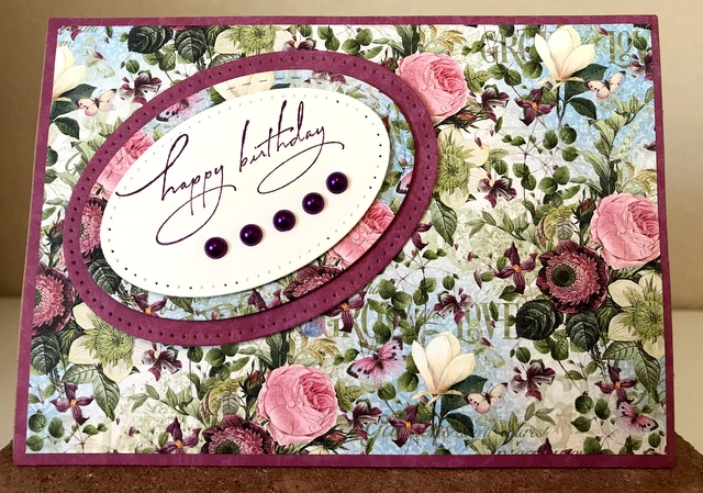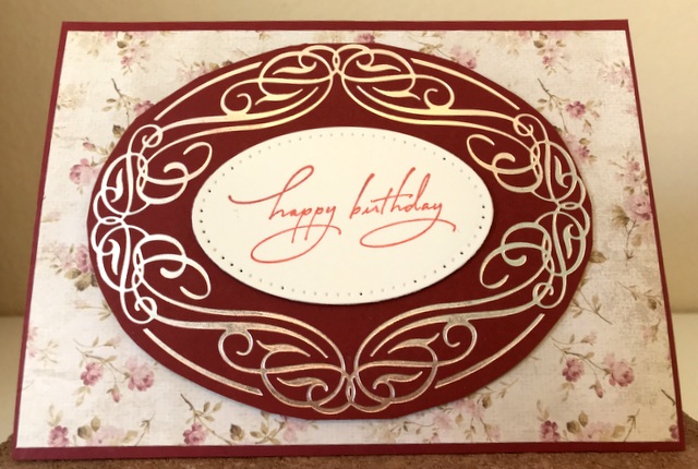 This is a 5″ by 7″ card. The pattern paper is Kaiser Craft Romantique Collection – page “Lacy”. The dies are Glimmer Plate – “Elegant Oval by Spellbinders and Stitched Oval by Elizabeth Craft Design.
