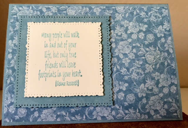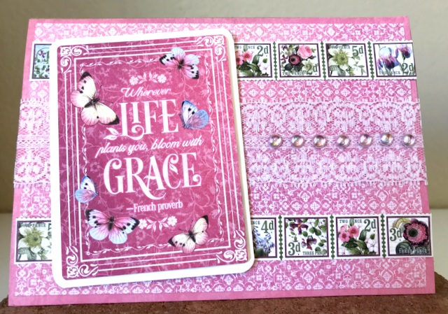 This is 5″ by 7″ card. The pattern paper is Graphic 45 Bloom Collection – page “Grow with Lace” and 12 by 12 Patterns and Solids Paper Pad. The die is “Vintage Stitched Squares” by Spellbinders.
