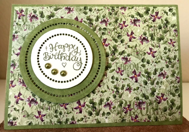 This is a 5″ by 7″ card. The pattern paper is Graphic 45 Bloom Collection – page “Dainty Blossoms” and 12 by 12 Patterns and Solids Paper Pad. The die is Spellbinders “Hemstitch Circle”. The ink is “Fresh Asparagus” by Gina K Designs. The bling is “Grass Green” by Queen & Co.