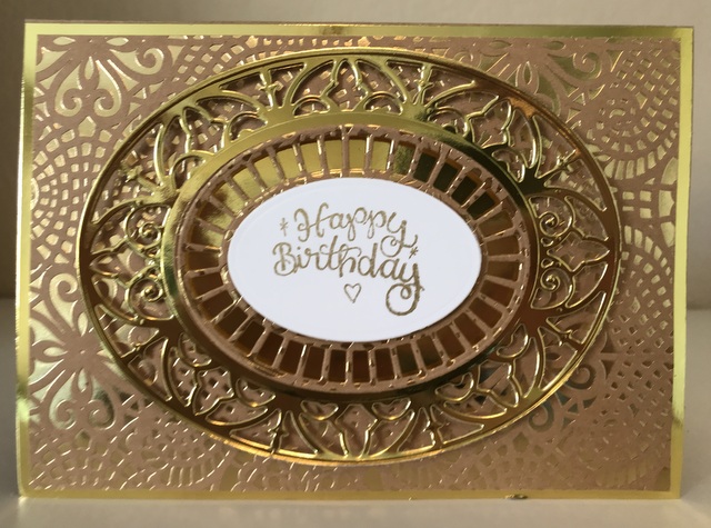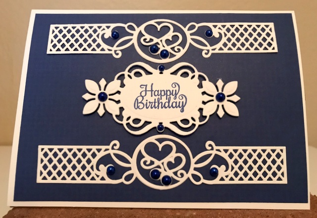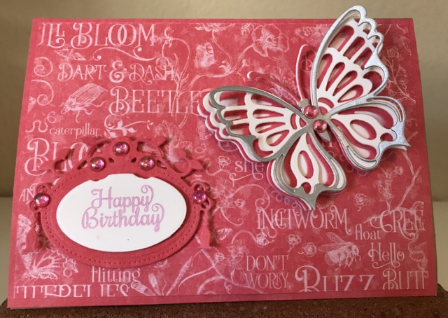 This is a 5″ by 7″ card. The pattern paper is from Graphic 45 Flutter Collection – “Patterns and Solid” pad. The butterfly is the Large Die of the Month February 2019 – Spellbinders. The tag is Spellbinders “Victorian Tags Two”. The bling is “Iridescent Bubbles Pink” by Queen and Co.