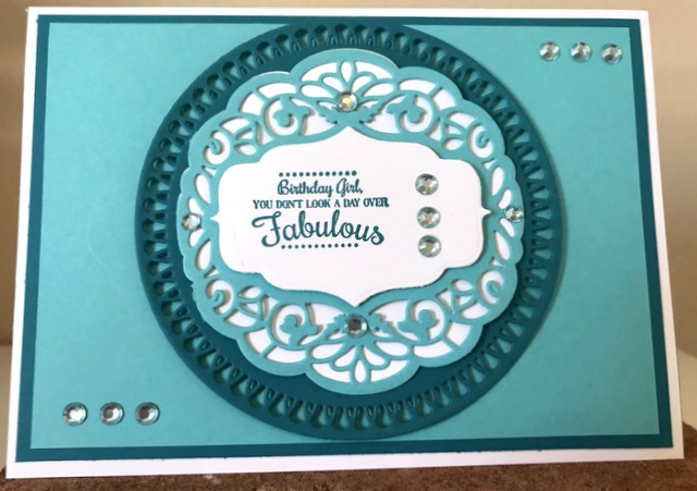 This is a 5″ by 7″ card. The cardstock is “Tranquil Teal”, “White”, and Turquoise Sea”from Gina K Design. The stamp is from Spellbinders “Special Birthday Sentiments”. The die is “Brillante Rondelle” from Spellbinders. The bling is “Baby Blue” from Queen & Co.