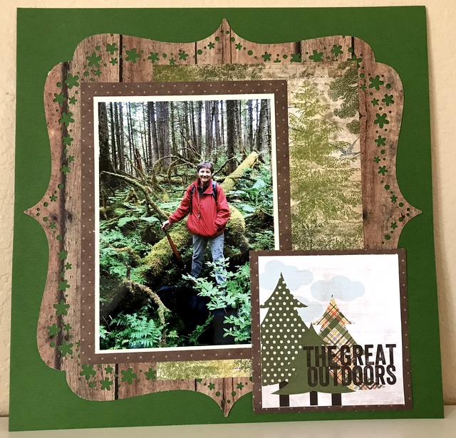 This is a 12″ by 12″ Scrapbook page of my sister-in-law in the forest around Juneau, Alaska.