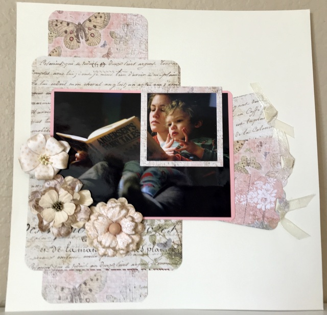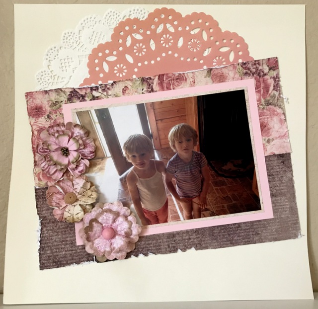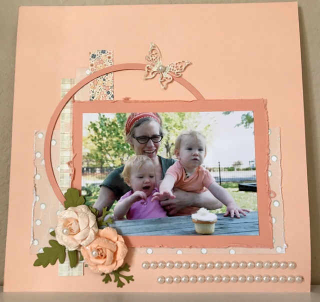 This is a 12″ by 12″ scrapbook page. I made it for a Shadow Box in my craft studio. The picture is of my nephew’s wife and his darling twin daughters.