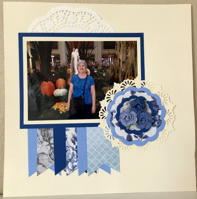 This is a 12″ by 12″ scrapbook page for my shadow box in my craft studio. This is a picture of a school librarian friend. We were celebrating my 70th birthday in Las Vegas!