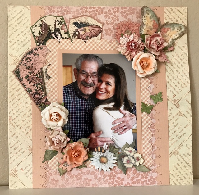 This is a 12″ by 12″ scrapbook page for the shadow boxes in my craft studio. This is very sweet picture of my wonderful step-father and his lovely daughter. The pattern paper is from a Graphic 45 collection.