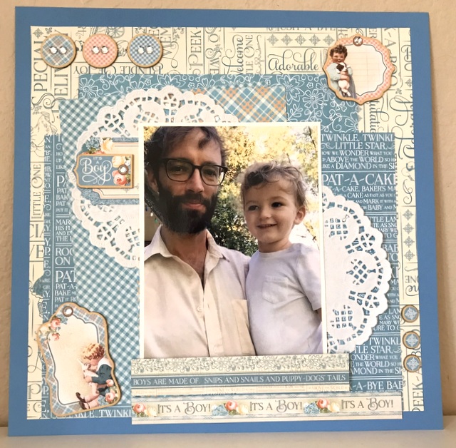 This is a 12″ by 12″ scrapbook page for my shadow boxes in my craft studio. The picture is of my nephew and his son. The pattern paper and embellishments are from The Precious Memories Collection by Graphic 45.