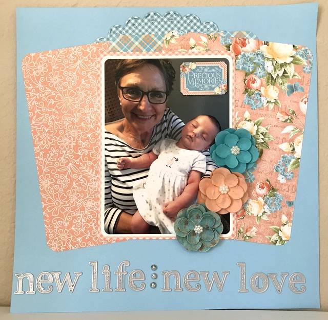 This is a 12″ by 12″ scrapbook page for my shadow boxes in my craft studio. The picture is of my sister-in-law’s latest grandchild! The pattern paper is from the Precious Memories Collection by Graphic 45. The dies are from Spellbinders – “Victorian Letters” and “Decorative Circles One”.
