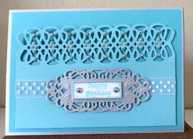 This is a 5″ by 7″ card. The cardstock is “Seaglass”, Turquoise”, and “Metallic Silver” by Gina K Designs The dies are Spellbinders “Infinity Link Border” and “Jubilee Tags”.