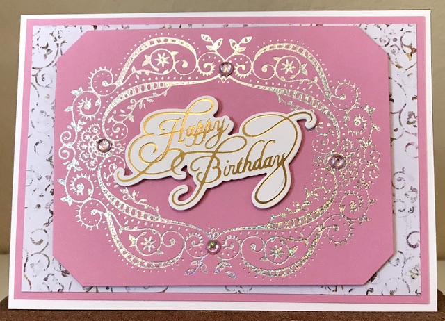 This is a 5″ by 7′ card. The pattern paper is from Prima collection – “Lavender”. The cardstock is “Bubblegum” and “White” by Gina K Designs. The Spellbinders dies are “Gilded Nested Rectangle”, Glimmer die “Elegant Occasion Sentiments”, and Glimmer Kit of the Month – May, 2019. The bling is from Queen & Co.