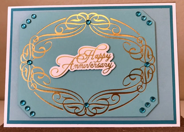 This is a 5″ by 7″ card. The cardstock is “Blue Lagoon”, “Ocean Mist, and “Seaglass” by Gina K Designs. The Spellbinders Glimmer Plates are “Elegant Oval” and “Elegant Occasion Sentiments”. The bling is from Queen & Co.