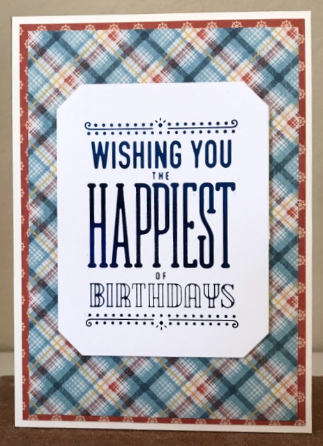 This is a 5″ by 7″ card. The pattern paper is from Graphic 45 By the Sea Collection – pages “Splash” and “By the Sea”. The cardstock is “White” by Gina K Designs. The dies are Spellbinders “Gilded Nested Rectangle” and Spellbinders Glimmer Plate “Happiest Birthday”.
