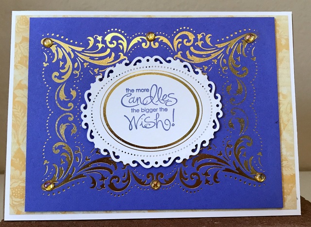 This is a 5″ by 7″ card. The pattern paper is Graphic 45 Floral Shoppe Collection – page “Indigo Lilies”. The cardstock and ink is “Wild Wisteria” by Gina K Designs. The dies are Spellbinders “Floral Ovals” and Spellbinders Glimmer Plate “The Contessa’s Seal Panel”.
