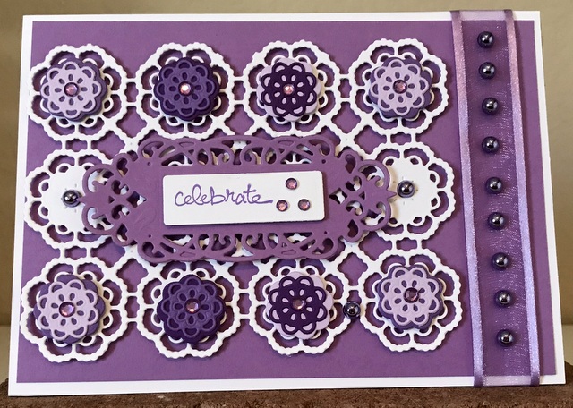 This is 5″ by 7″ card. The cardstock is “Wild Lilac”, “Lovely Lavender” and “Vibrant Violet” by Gina K Designs. The Spellbinders dies are Amazing Paper Grace Die of the Month Sept. 2019 – “Snip It Flowers” and “Jubilee Tags”. The bling is “Indigo” and “Metallic Bubbles” by Queen & Co.