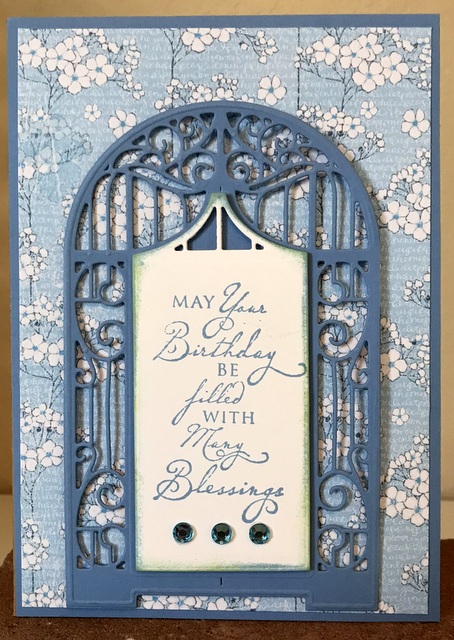This is a 5″ by 7″ card. The pattern paper is from Stamperia Baby Boy Collection. The cardstock and ink is “Powder Blue” by Gina K Designs. The die is Spellbinders “Graceful Concertina”