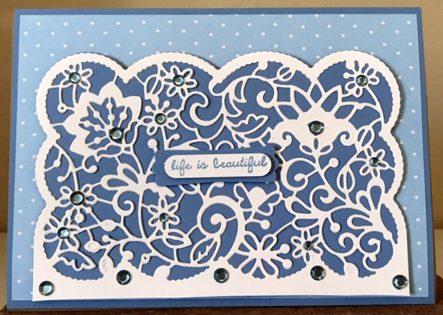 This is a 5″ by 7″ card. The pattern paper is from Stamperia Baby Boy Collection. The cardstock is “White” and “Powder Blue” by Gina K Designs. The die is Spellbinders “Candlewick Lace Card Front.” The bling is “Baby Blue” by Queen & Co.