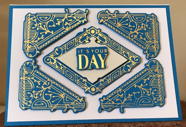 This is 4″ by 5 1/2″ card. The cardstock is “White” and “Blue Raspberry” by Gina K Designs. The die is Spellbinders Glimmer Plates Sept. 2019 – “Brilliant Corners & More”.