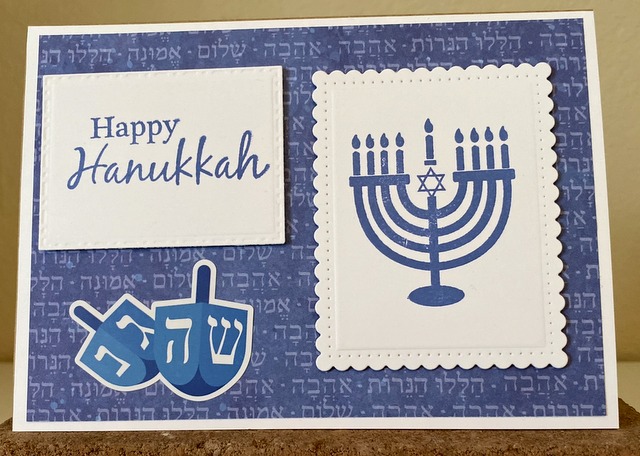 This is a 5″ by 7″ card. The pattern paper is from Photo Play Paper Co. “Happy Hanukkah” Collection. The Spellbinders die is “Fancy Edged Rectangles”