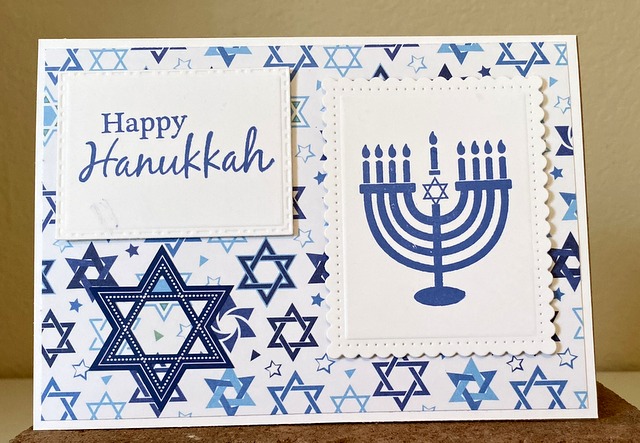 This is a 5″ by 7″ card. The pattern paper is from Photo Play Paper Co. Happy Hanukkah Collection. The die is Spellbinders “Fancy Edged Rectangles”.