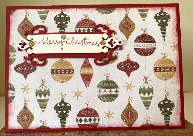 This is a 5″ by 7″ card. The pattern paper is Echo Park Paper Co. Ti’s the Season Collection – page “Dashing Reindeer” The Spellbinders Glimmer Plate is “Ornament”. The cardstock is “Cherry Red” by Gina K Designs.