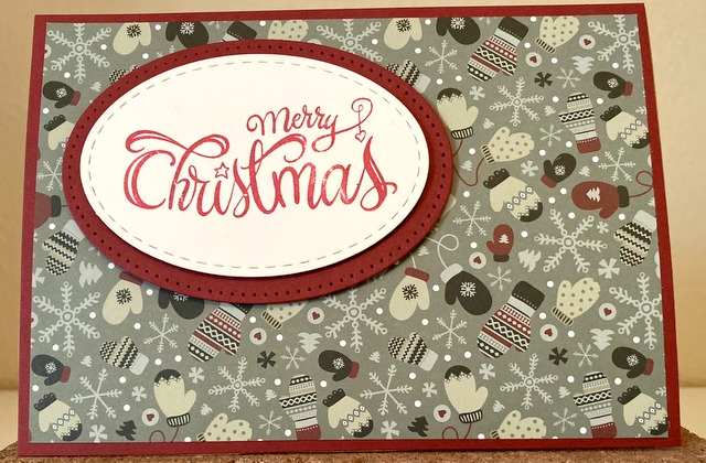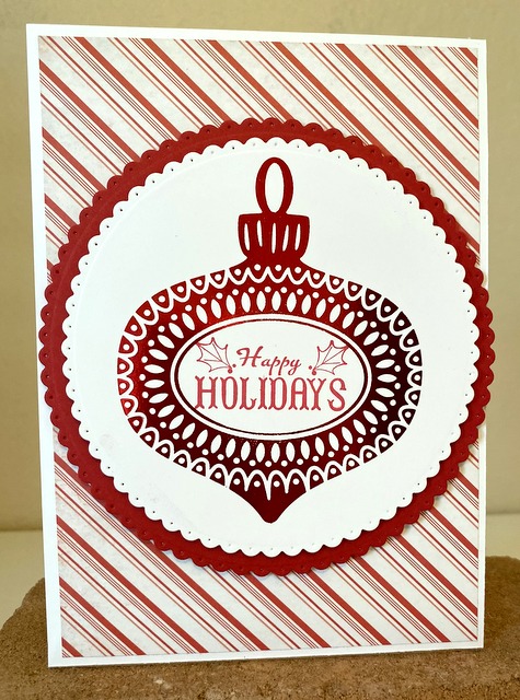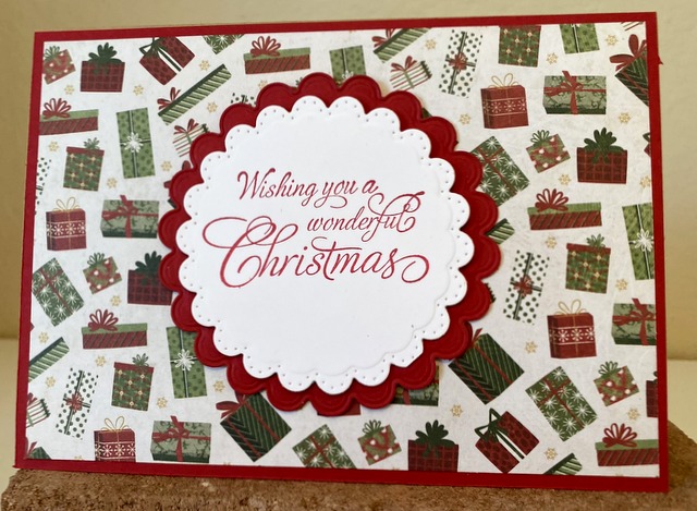 This is a 5″ by 7″ card. The pattern paper is Photo Play Christmas Memories Collection – page “Under the Tree”. The cardstock and ink is “Cherry Red” by Gina K Designs. The Spellbinders die is “Fancy Scallop Edge Circles”.