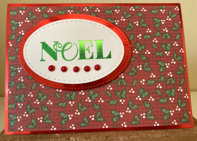 This is a 5″ by 7″ card. The Glimmer Plate “Noel” is by Spellbinders. The bling is “Berry Red” by Queen & Co.