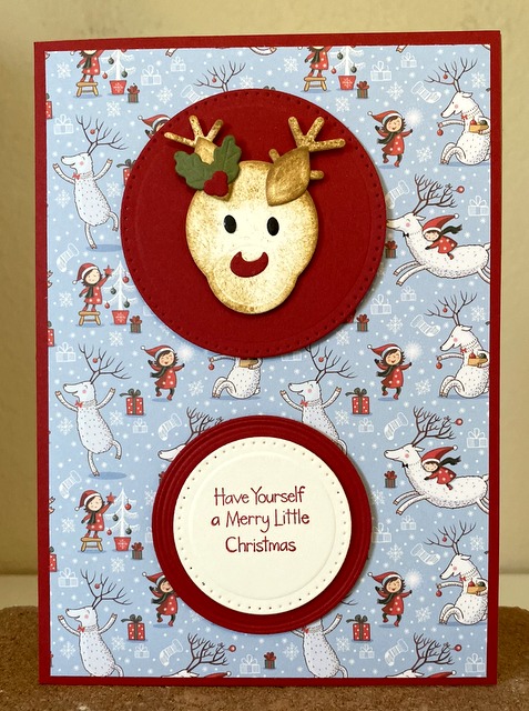 This is a 5″ by 7″ card. The pattern paper is Moda Scrap White Christmas Collection. The cardstock is “White” and “Cherry Red” by Gina K Designs. The Spellbinders dies are “Reindeer” and “Scored and Pierced Circles”.