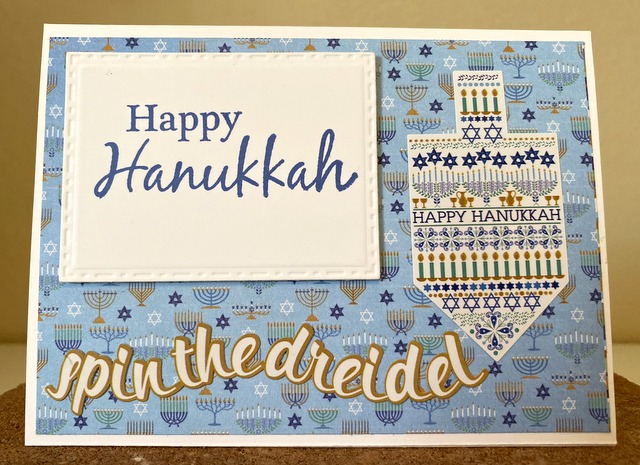 This is a 4″ by 5 1/2″ card. The pattern paper is from Photo Play Paper Co. Happy Hanukkah Collection. The Spellbinders die is “Fancy Edged Rectangles”.