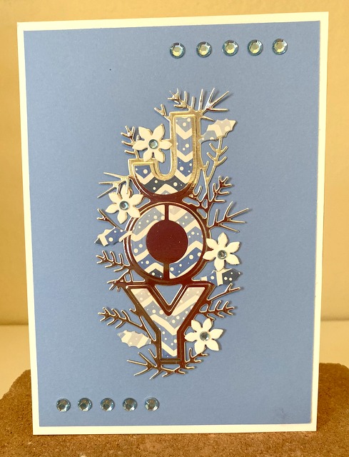 “Joy” Christmas Card Dec1 This a 5″ by 7″ card. The pattern paper is Moda Scrap “Let it Snow Collection”. The Spellbinders die is “Joy”. The cardstock is “White” and “Powder Blue” by Gina K Designs. The bling is “Baby Blue” from Queen & Co.
