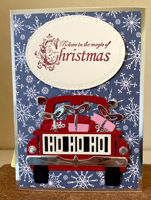 Merry Christmas Truck Card Dec5 This is a 4″ by 5 1/2″ card. The die is Spellbinders Small Die of the Month – Oct. 2018.