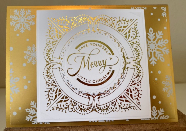 Merry Filigree Quatrefoil Glimmer Die Christmas Card Dec8 This is a 5″ by 7″ card. The glimmer plate is from Spellbinders “Merry Filigree Quatrefoil